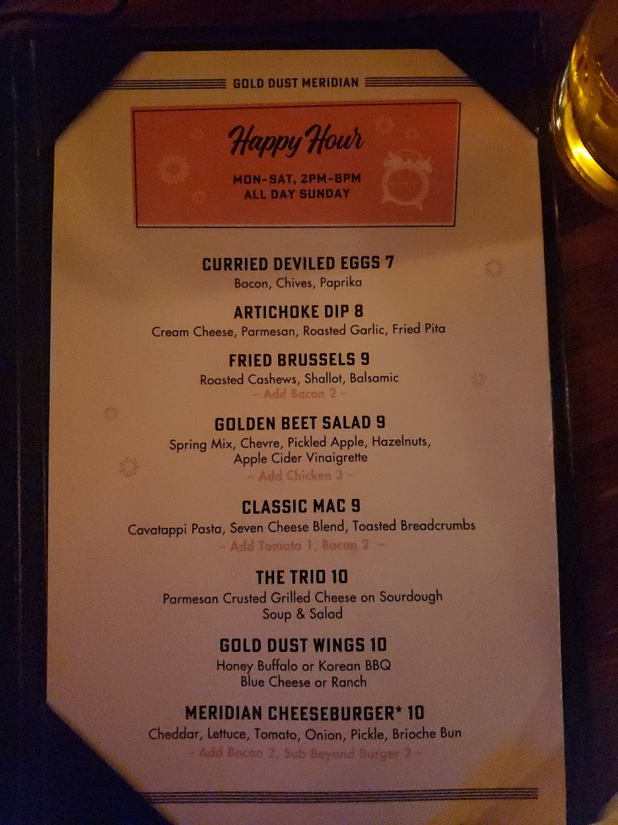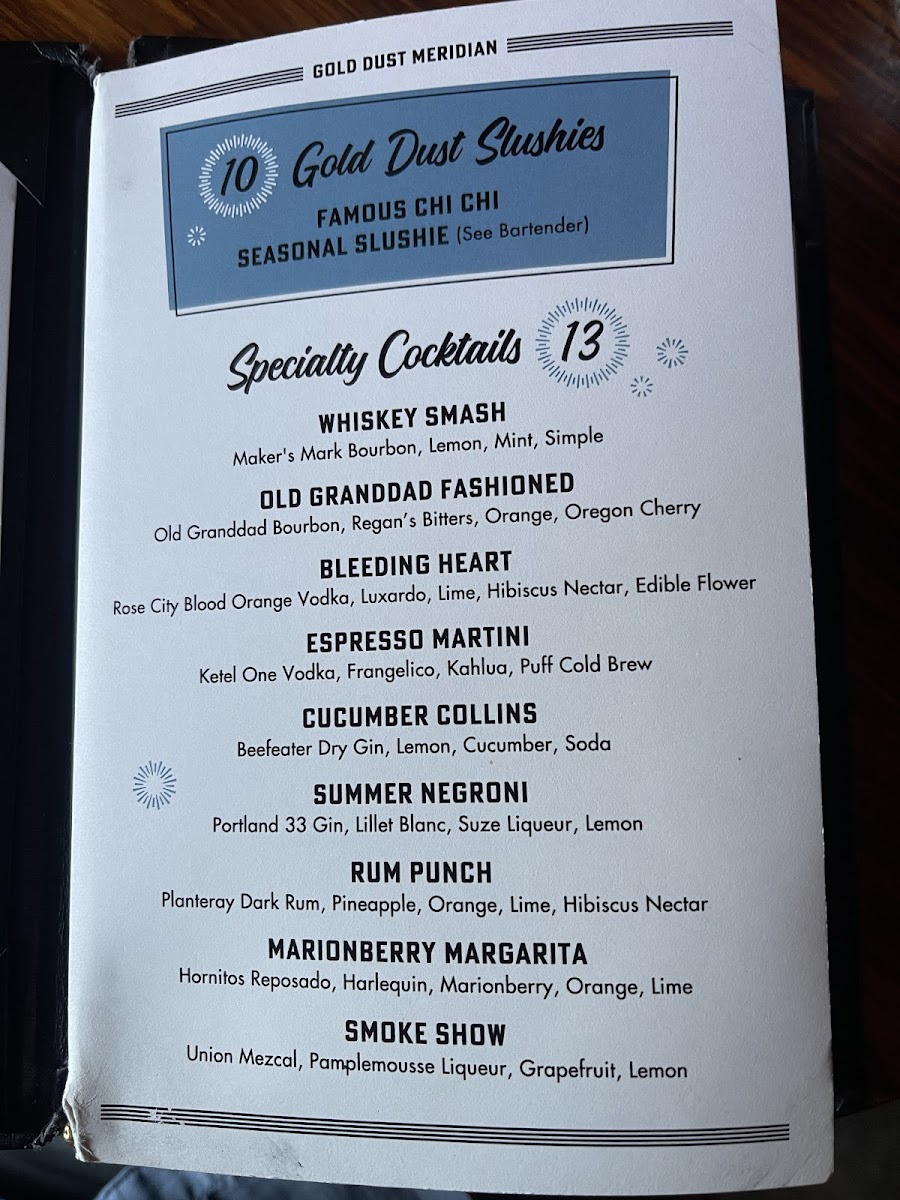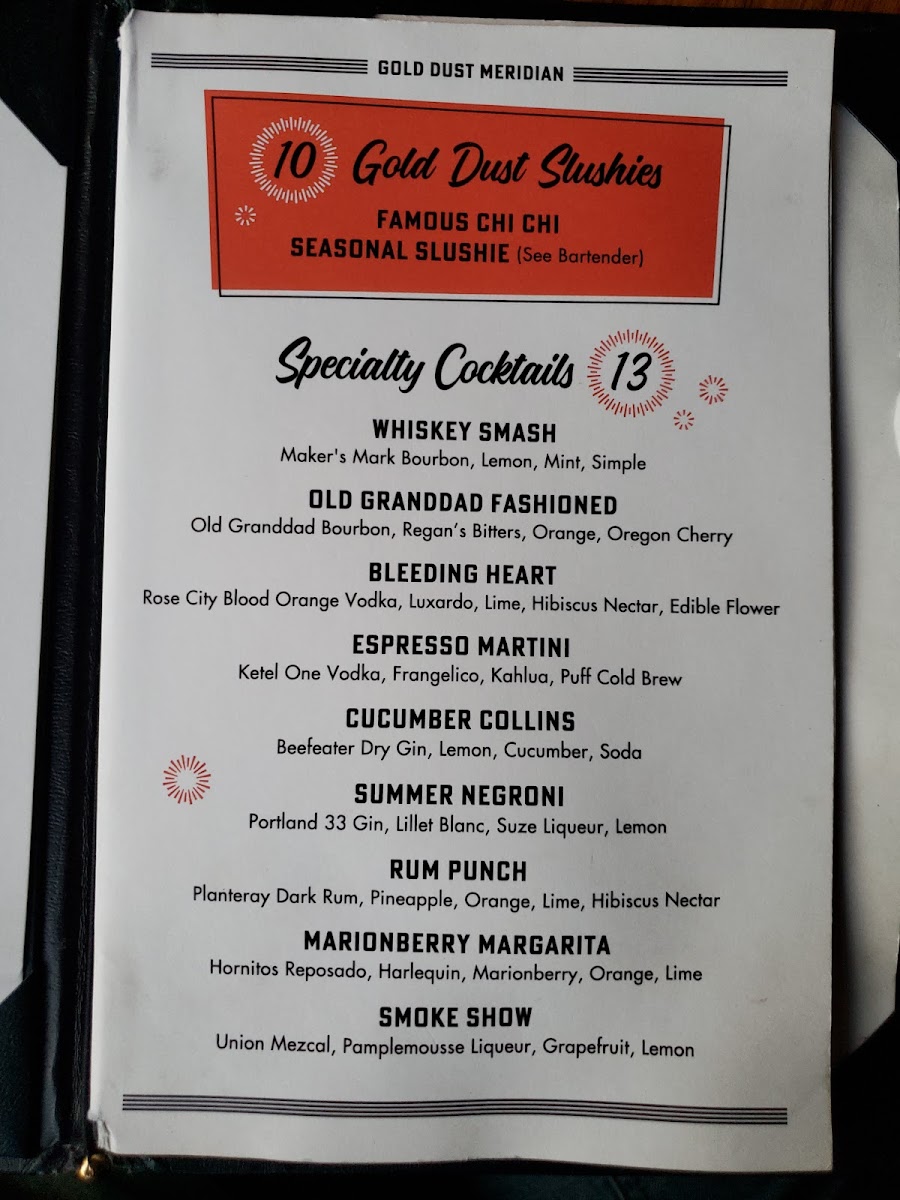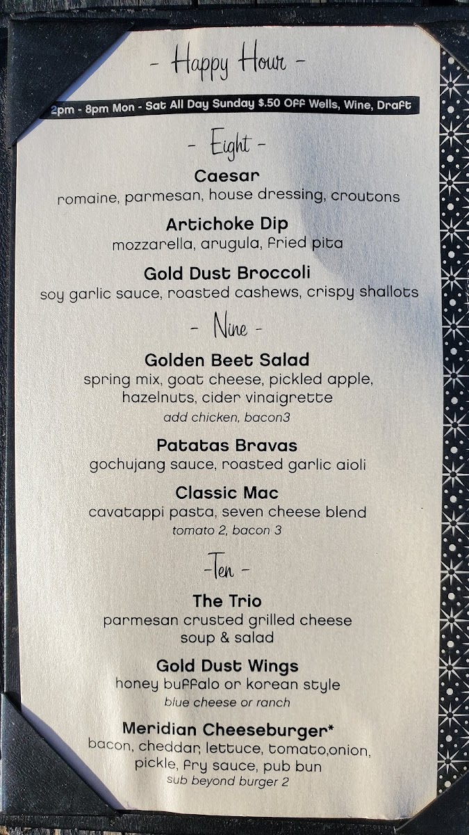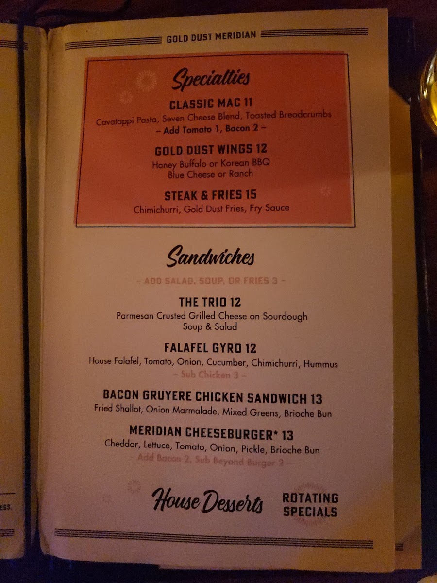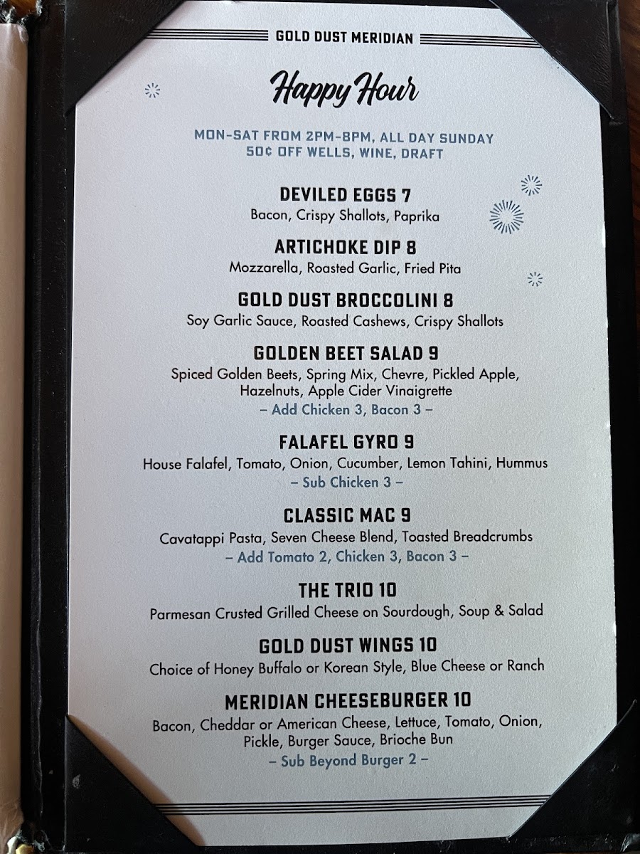 Whether stopping in for a casual drink or settling in for a relaxed meal, the menu at Gold Dust Meridian fits seamlessly into the unhurried, comfortable setting. The approachable dishes and carefully balanced cocktails create an experience that encourages lingering conversation and easy enjoyment.